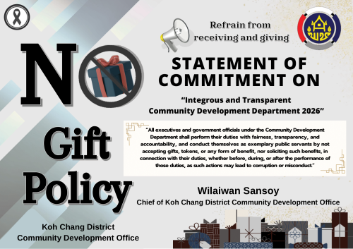 สำนักงานพัฒนาชุมชนอำเภอเกาะช้าง (สพอ.เกาะช้าง) นำโดยนางสาววิไลวรรณ แสนสร้อย พัฒนาการอำเภอเกาะช้าง พร้อมด้วยเจ้าหน้าที่พัฒนาชุมชนอำเภอเกาะช้าง ร่วมกันประกาศเจตนารมณ์ขับเคลื่อนองค์กรภายใต้หลัก “สุจริต โปร่งใส พัฒนาชุมชนใสสะอาด” และนโยบาย “งดรับ งดให้ของขวัญ ของกำนัลทุกชนิดจากการปฏิบัติหน้าที่ (No Gift Policy)”
