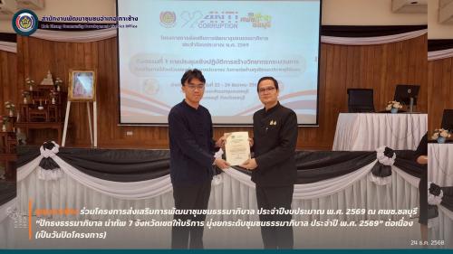 นางสาวมนทิรา เข็มทอง ผู้ตรวจราชการกรม ปฏิบัติหน้าที่ผู้อำนวยการศูนย์ศึกษาและพัฒนาชุมชนชลบุรี มอบหมายให้ นายชัยทวัตน์ ดำศรีสวัสดิ์ ผู้อำนวยการกลุ่มงานบริการทางวิชาการ เป็นประธานในพิธีปิดโครงการการส่งเสริมการพัฒนาชุมชนธรรมาภิบาล ประจำปีงบประมาณ พ.ศ. 2569 (กิจกรรมที่ 1 การประชุมเชิงปฏิบัติการการสร้างวิทยากรกระบวนการส่งเสริมการมีส่วนร่วมของผู้แทนภาคประชาชนในการต่อต้านการทุจริตและประพฤติมิชอบ) พร้อมมอบแนวทางการนำความรู้ไปสู่การปฏิบัติในพื้นที่