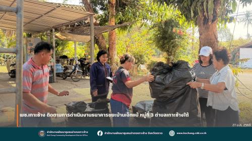นางสาววิไลวรรณ แสนสร้อย พัฒนาการอำเภอเกาะช้าง พร้อมเจ้าหน้าที่พัฒนาชุมชนร่วมลงพื้นที่ติดตามการดำเนินงาน 1 หมู่บ้าน 1 ธนาคารขยะ ณ บ้านเจ็กแบ้ หมู่ที่ 3 ตำบลเกาะช้างใต้ เพื่อร่วมดำเนินการและสังเกตการณ์การคัดแยกและซื้อขายขยะในพื้นที่ และร่วมมอบของกิจกรรมเนื่องในวันปีใหม่ให้กับผู้ที่มาซื้อขายขยะ